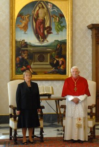 La Presidenta de la República, Michelle Bachelet, fue recibida ayer en audiencia por Su Santidad el Papa Benedicto XVI, encuentro privado que se extendió por treinta y nueve minutos en la biblioteca privada del Pontífice. “Estoy extraordinariamente contenta de haber podido tener esta audiencia con Su Santidad y haber entregado, primero que nada, a nombre de todo el pueblo chileno, de esos millones de mujeres y de hombres católicos, y también de muchos hombres y mujeres de buena voluntad, el reconocimiento que Chile tiene por la Iglesia Católica, por el relevante rol que tuvo, ha tenido y seguirá teniendo en la historia de nuestro país”, señaló la Mandataria luego de la reunión.