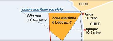 Chile, por su parte, utiliza la línea del paralelo para fijar la frontera marítima y argumenta que el límite territorial no está a orillas del mar, sino en el denominado Hito 1, unos 220 metros tierra adentro hacia el nordeste.