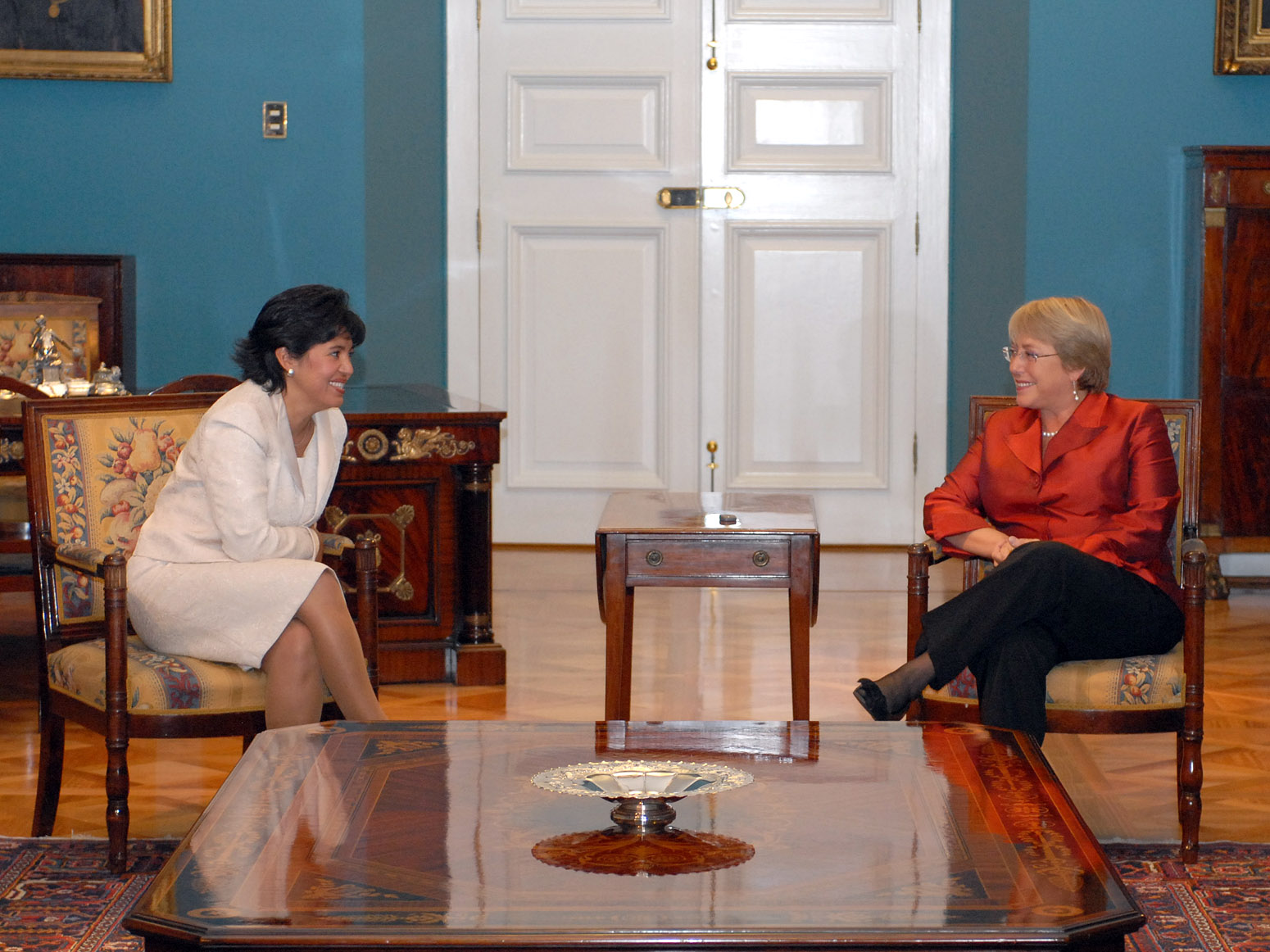 Pérez Yoma y Vidal conversaron con la Presidenta en el salón vip de la terminal. Tras la cita, la jefa de Estado se trasladó a La Moneda donde llegó a las 17:10 horas y fue recibida por la guardia de palacio con el saludo de honor.