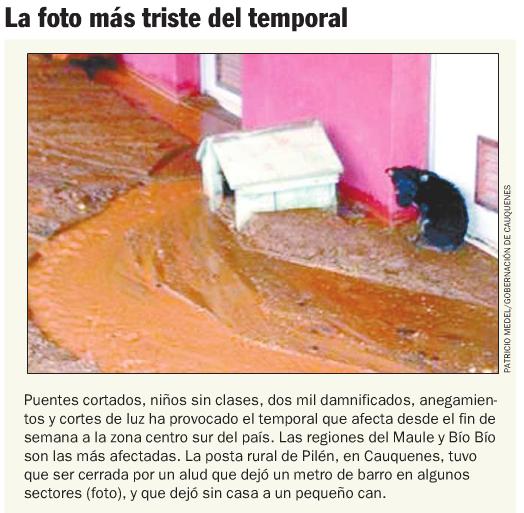 Balto es el nombre de este tierno canino que conmovió al país al aparecer el miércoles 21 de mayo en las páginas interiores del diario Las Últimas Noticias. En la imagen se aprecia la tristeza del can ante el duro momento por el que atravesaba Pilén luego de un alud que provocó el anegamiento de la posta del sector, ingresando gran cantidad de agua y barro.