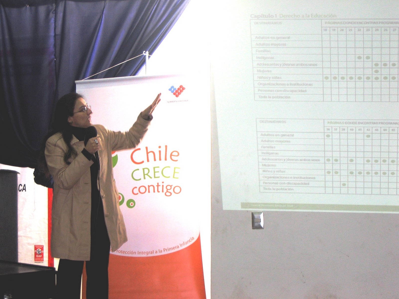 La actividad, se realizó el Centro Comunitario Provincial de Talca y en ella la Patricia Miranda sostuvo que «nuestros esfuerzos han estado centrados en la instalación de un Sistema de Protección Social con perspectiva de derecho, que articule la oferta programática en materia de políticas sociales y esta guía es un valioso instrumento para que las personas, las familias y la comunidad se informen de cuáles son sus derechos y dónde exigirlos».
