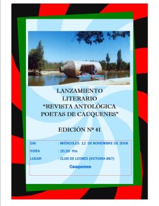 El Miércoles, 12 de noviembre de 2008 , en el Salón de Actos del Club de Leones de Cauquenes, ubicado en Victoria número 867, se efectuará el Lanzamiento de la Edición número 41 de la Revista Antológica “Poetas de Cauquenes”.