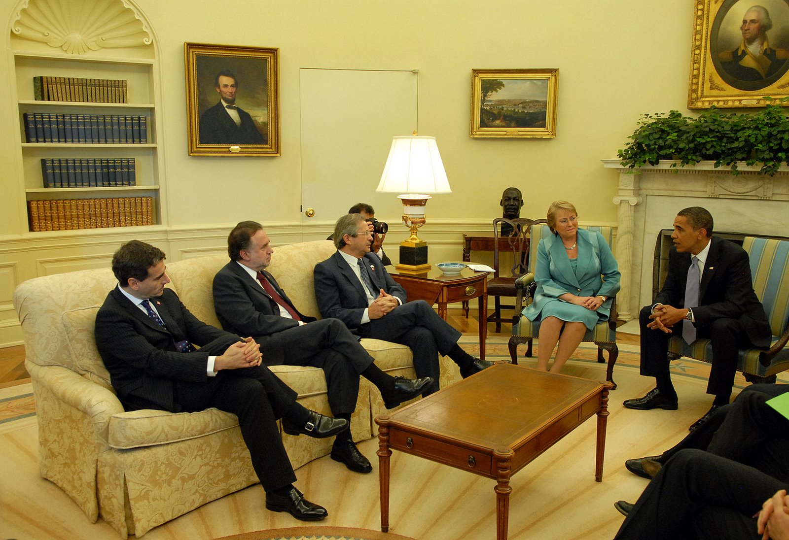Durante el encuentro que los mandatarios sostuvieron con la prensa en el salón Oval, la Jefa de Estado chilena señaló que «entendemos la manera en que está usted (Presidente Obama) desarrollando su liderazgo, es algo que nos inspira y nos hace sentir muy confiados y muy a gusto». Agregó, además, que «queremos felicitar al Presidente Obama por su política exterior y por todos los esfuerzos que realiza a nivel nacional e internacional, buscando tener una buena respuesta ante esta crisis económica».