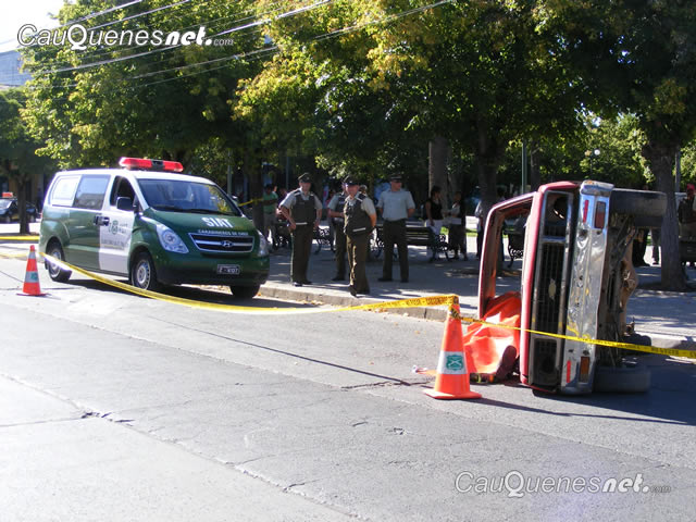 Atónitos e impactados fue lo que se vio en cada una de las personas y algunos funcionarios públicos que trabajan frente a la Plaza de Armas de Cauquenes por calle Antonio Varas al percatarse que en plena calzada se encontraba una camioneta volcada con una persona muerta en su interior.