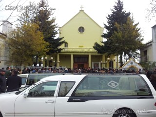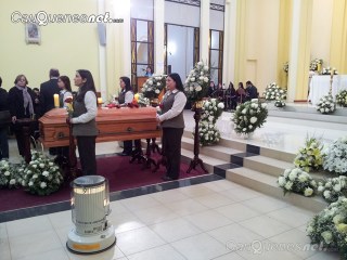 Son las 12 del día y suena la sirena del Cuerpo de Bomberos -del cual Rodríguez también fue integrante- la que se funden con el tronar de las campanas del templo que anuncia el comienzo de la ceremonia de despedida. Cientos de personas repletan la iglesia, otros muchos se agolpan en las afueras. El obispo de la diócesis de Linares, Tomislav Koljatic, da inicio y preside el responso fúnebre, en el que resaltará la calidad profesional y humana de Rodríguez.