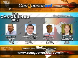 Los resultados parciales se condicen con la encuesta realizada por Cauquenesnet.com en septiembre pasado que le otorgó la primera mayoría a Juan Carlos Muñoz con un 52,95%, el segundo puesto para Guillermo Badilla con 33,4%, el tercer puesto para Juan Carlos Soto con el 7% y el cuarto puesto para Jaime Campos con un 6,5%. El margen de error fue de 4%.