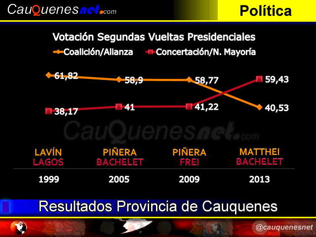 Las pasadas elecciones presidenciales marcaron un hito en la provincia de Cauquenes, por primera vez la Nueva Mayoría (ex Concertación) se imponía en una segunda vuelta presidencial con el 59,43% de los votos, frente a un 40, 5% de la Coalición (o Alianza), proceso que si lo comparamos con el del año 2005, con los mismos actores en competencia, fueron casi los iguales resultados pero de manera inversa.