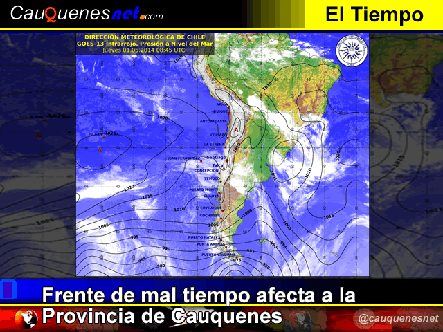 Pero no sólo el sector costero se verá afectado por este frente de mal tiempo, ya que la Dirección Meteorológica de Chile pronosticó para este día jueves 1 de mayo, una máxima de sólo 13 grados para Cauquenes, lo que estará acompañado de precipitaciones y viento cuya intensidad variará entre los 25 y 40 kilómetros por hora.