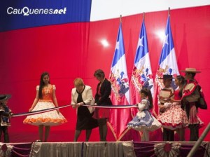 Tras los discursos, la Jefa de Estado, acompañada por su hijo, Sebastián Dávalos, bailó el primer pie de cueca de la Fonda Oficial, “Los lagos de Chile”, interpretada por el conjunto folclórico La Gallera. Al finalizar, los miembros del Club de Huasos Gil Letelier subieron al escenario para realizar junto a la Mandataria y la alcaldesa de Santiago el tradicional brindis con cacho de chicha.