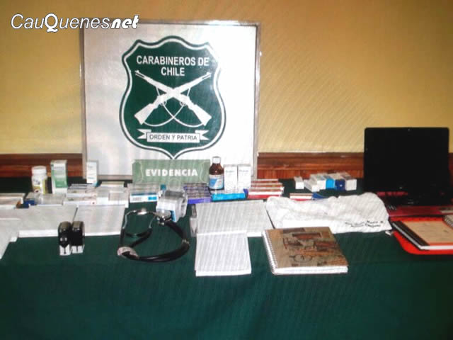 Los efectivos policiales -además- le incautaron sus agendas de contactos, talonarios de recetas y licencias médicas, timbres, estetoscopio y una gran cantidad de medicamentos.