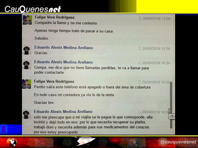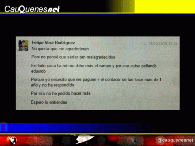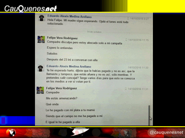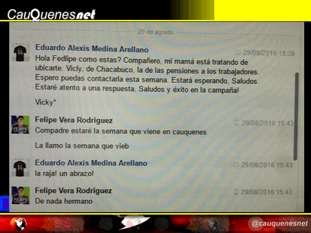 Como pueden ver en los pantallazos, están las fechas y las conversaciones, ahí hablo de más de 600 mil pesos, pero el monto es mayor (también Felipe Vera le debe por unos trabajadores que llegaron a Covica (Cooperativa Vitivinícola de Cauquenes), no es sólo una. Soy transparente y sincero, no me interesa la plata sucia, no me interesa mentir, no lo necesito. Sólo quiero la verdad, que todo se conozca que se respete a mi madre, a todas las mujeres y a cada uno y una de los cauqueninos y cauqueninas. Exijo RESPETO, para todos.