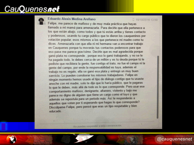 No tengo relación alguna con ningún candidato, por lo que no me interesa con esto tener un fin político, sólo que mi pueblo tenga conocimiento de esta situación en particular y con ello sepa por quien está votando, creo que Cauquenes merece algo mejor.