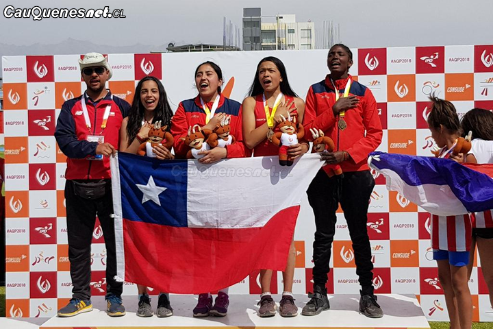 El equipo chileno del 5×80 metros adaptado damas, del que forma parte Yester Ávila, recibiendo el Oro hoy en Perú.
