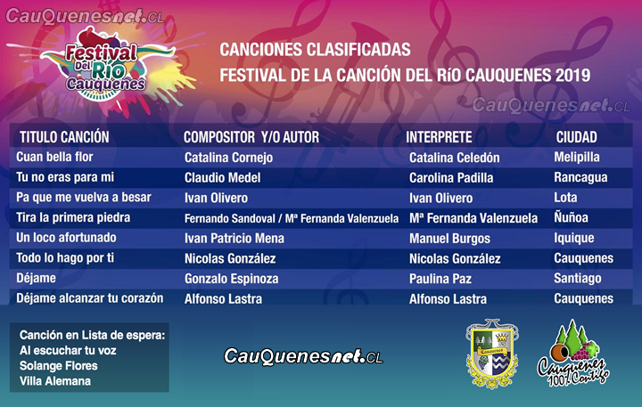 De las ocho canciones escogidas por un jurado preseleccionador, hay dos representantes de Cauquenes; se trata de Nicolás González quien participa con el tema «Todo lo hago por ti» de su autoría y composición y de Alfonso Lastra, quien este año participa con la canción «Déjame alcanzar tu corazón» de la cuál -también- es autor y compositor.