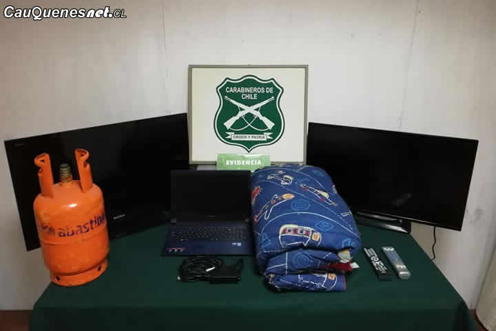 El hombre de iniciales M.J.G.L. de 48 años fue detenido en avenida Ruiz Martinez en el Barrio Estación, quien al momento de la detención, se le incautó un notebook color azul marca Lenovo, un televisor LCD marca Sony color negro sin cable de corriente, un televisor LED marca AOC de color negro con su respectivo cable de corriente, un cilindro de gas de la marca Abastible para 5 kilos, un control remoto marca AOC de color negro, un control remoto de color plomo marca Njoy Tech y un cobertor color azul con diferentes diseños.
