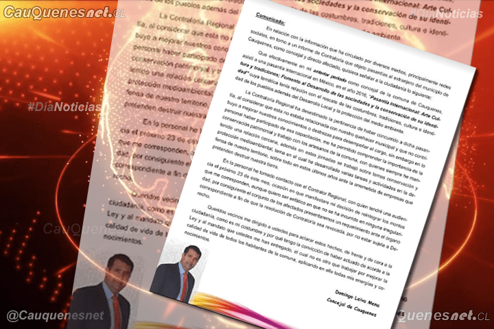 En su comunicado Leiva partió señalando: «En relación con la información que ha circulado por diversos medios, principalmente en redes sociales, en torno a un informe de Contraloría que objetó pasantías en el extranjero del municipio de Cauquenes, como concejal y directo afectado, quisiera señalar a la ciudadanía lo siguiente…»