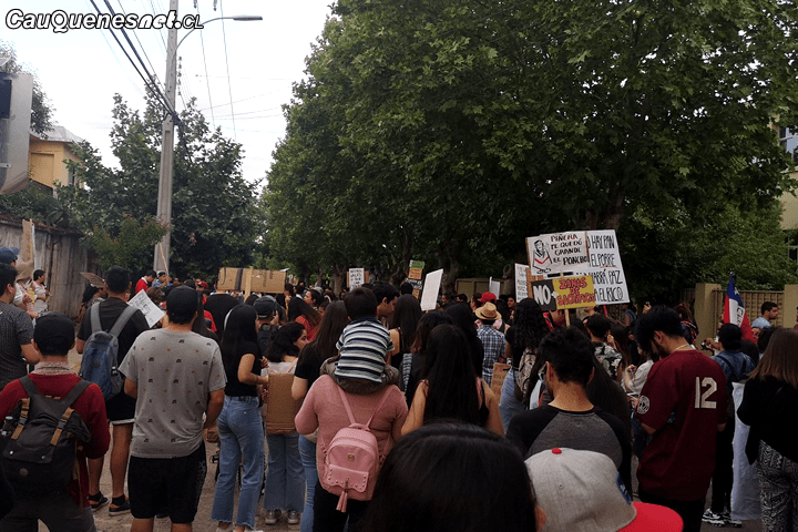 Los ciudadanos participantes luego, a rostro descubierto, sin capuchas y con carteles como «Nueva Constitución», «Hasta que la Dignidad se haga costumbre», «Tengo más vocación que campo laboral» y «No + AFP», entre otros, se trasladaron marchando por Claudina Urrutia hasta el acceso norte de la ciudad, a la altura del puente Trucco, en donde los automóviles tuvieron que cumplir con la consigna «el que baila pasa».