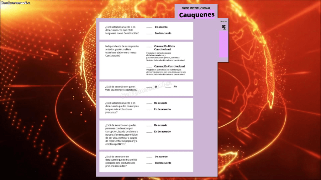 Las temáticas son referente a la constitución y la política. Por ejemplo la primera pregunta dice «¿Está usted de acuerdo o en desacuerdo con que Chile tenga una nueva Constitución?, las opciones de respuesta son «De acuerdo» o «En desacuerdo». La segunda pregunta pide su opinión respecto a «¿Quién prefiere usted que elabore la Constitución», las opciones de respuesta son: Una «Convención mixta constitucional» (Conformada en un 50% por actuales parlamentarios y el otro 50% por miembros constituyentes elegidos por la ciudadanía) o una «Convención Constitucional» (Conformada completamente por miembros constituyentes elegidos por la ciudadanía). Las otras tres preguntas guardan relación con la obligatoriedad del voto, las atribuciones de los municipios y si está de acuerdo con bajar el IVA a los productos de primera necesidad.