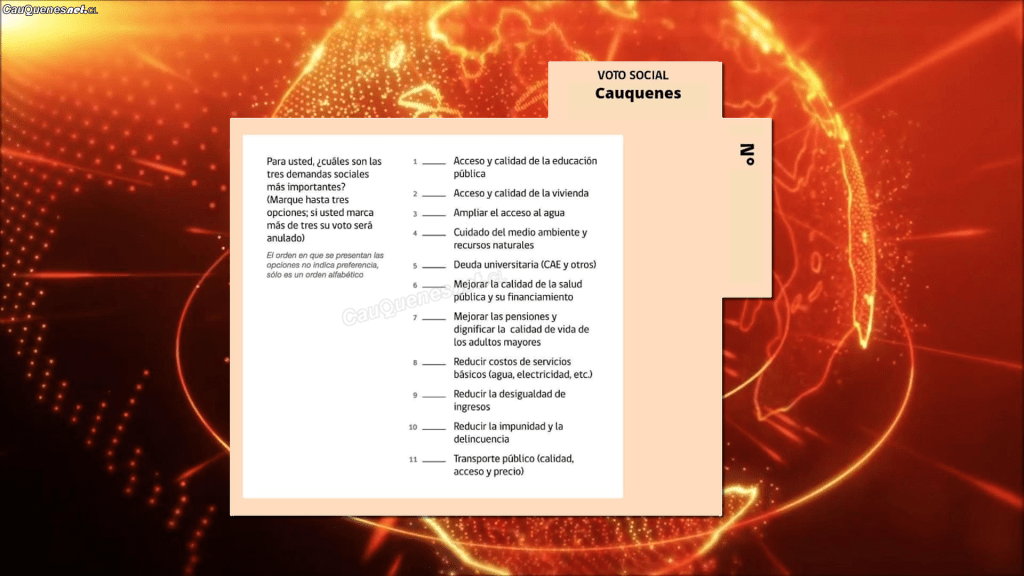 La segunda cédula es el Voto Social, consta de una sola pregunta que es «Para usted cuáles son las tres demandas sociales más importantes?» y tiene 11 opciones de respuestas de las cuales usted debe elegir un máximo de tres (3), si elige más de tres su voto será anulado.