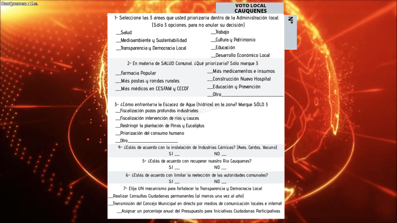 Mientras que la tercera papeleta es el Voto Local, aquí las personas que participen del proceso podrán opinar referente a temáticas que atañan a la comuna de Cauquenes. Esta cédula consta de siete (7) preguntas, en cuyos enunciados se dan las indicaciones para responder correctamente.