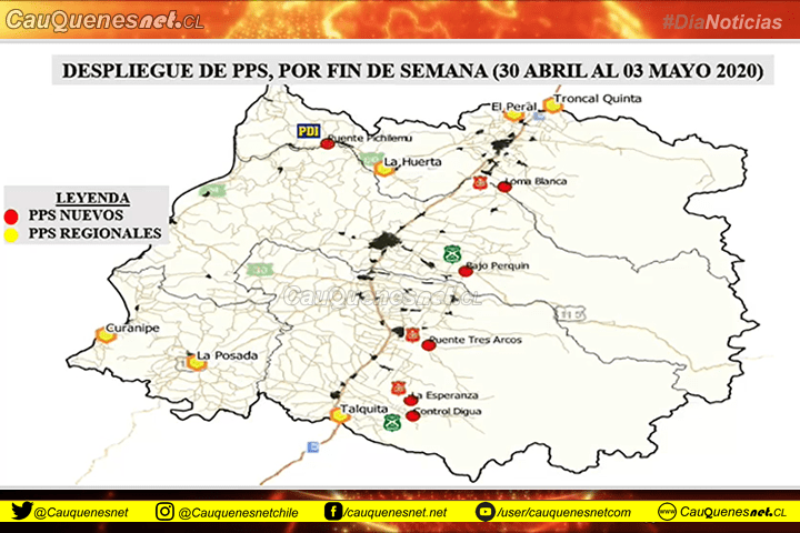 Mientras que los nuevos puntos de control sanitario son, «En la zona de Lomas Blancas en Molina, en el puente Tres Arcos en la comuna de Linares, en el cruce la esperanza en la comuna de Longaví, en bajo Perquín en San Clemente, sector la Ligua en Parral y puente Pichilemo en Licantén.