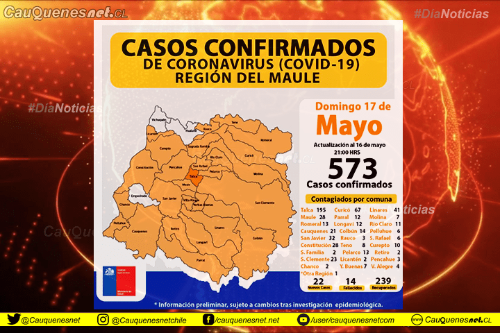 Tras los resultados entregados por la Seremi de Salud del Maule, se confirmaron 573 casos de COVID-19 en la región, teniendo 22 nuevos casos para el informe del 17 de mayo.