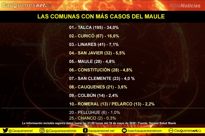 En el siguiente cuadro, tenemos las 10 comunas de la región del Maule con mayor cantidad de contagiados. Aquí se puede apreciar que Talca y Curicó concentran el 50% de casos maulinos. Cauquenes -en tanto- aparece en el puesto número 8 a nivel regional.
