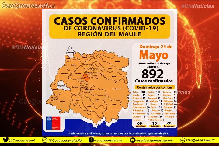 Tras los resultados entregados por la Seremi de Salud del Maule, se confirmaron 892 casos de COVID-19 en la Región, teniendo 69 nuevos casos para el informe de este domingo 24 de mayo (con datos recogidos hasta las 21:00 horas del 23 de mayo).