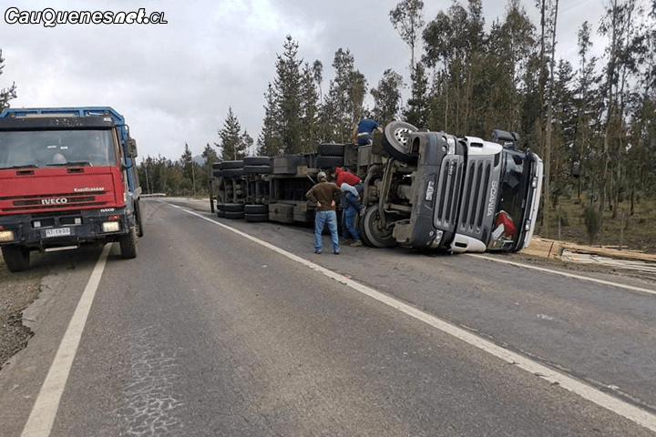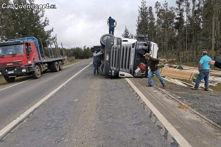 Durante la mañana de hoy un camión cargado con madera volcó en el sector Zorzal Blanco, a la salida de Qurihue en la ruta que une a dicha comuna con Cauquenes.