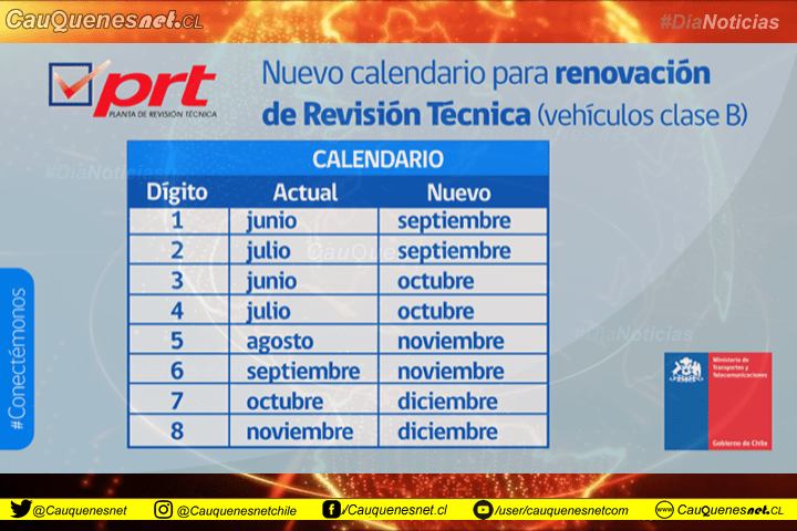 Además, el MTT prorrogó los plazos para la renovación de las revisiones técnicas creando un nuevo calendario, donde el plazo para los vehículos con sus placas finalizadas en los dígitos 1 y 2 vence el próximo miércoles 30 de septiembre.