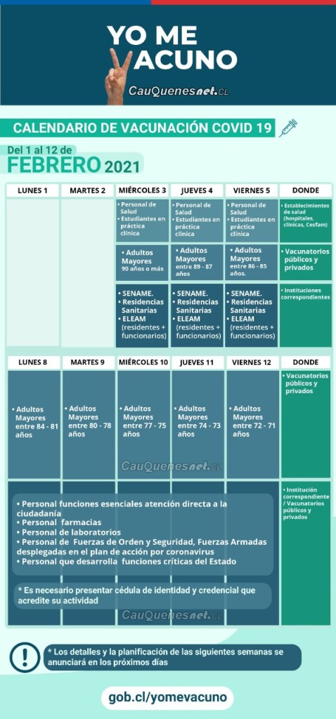 Con este nuevo cargamento comenzará el plan masivo de vacunación, este se iniciará el miércoles 3 de febrero. De acuerdo al calendario oficial, ese día se comenzará con la vacunación del personal de salud y estudiantes de prácticas clínicas, los adultos mayores de 90 años o más, trabajadores del Sename, personal de residencias sanitarias y residentes y funcionarios de Establecimientos de Larga Estadía de Adultos Mayores.