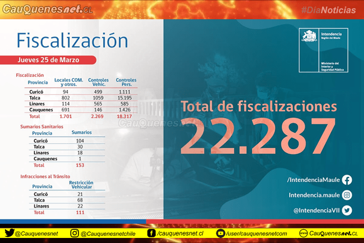 El jueves también hubo fiscalizaciones y según datos oficiales de la Intendencia de la Región del Maule en toda la provincia de Cauquenes se fiscalizaron 691 locales comerciales -incluso más que en las provincias de Curicó (94) y Linares (114)-, además de 146 controles vehiculares y 1.426 controles a personas. Durante esta jornada se cursó sólo un sumario sanitario en toda nuestra provincia.