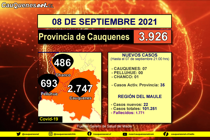 En nuestra provincia, el reporte indica que Cauquenes registró 07 casos nuevos, mientras que Chanco sumó 01 y Pelluhue no presentó nuevos contagios.