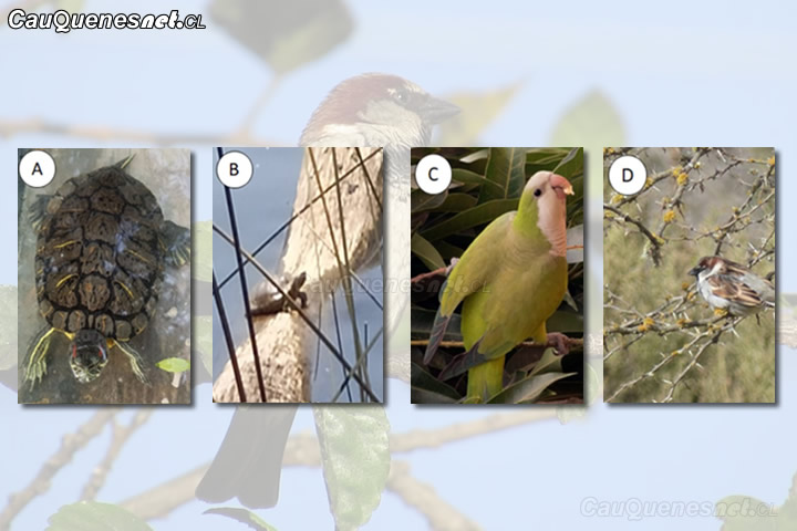 Por su parte, Chile tiene dos ejemplos llamativos de este fenómeno, las tortugas de orejas rojas (Tachemys scripta, ver imagen A, B), y la cotorra argentina (Myiopsitta monachus, ver imagen C). La cotorra argentina llegó a Chile como un “ave de jaula” y comenzó a ser liberada por sus propietarios en la década del 70 en la comuna de Santiago; posteriormente, la especie colonizó con rapidez los perímetros urbanos de Santiago y las comunas aledañas estableciendo colonias reproductivas y logrando una masiva dispersión poblacional. Esta ave consume todo tipo de frutos, incluyendo los de interés comercial por lo que es considerada problemática para el sector productivo agrícola, pero lo más relevante al caso es que puede afectar a las especies de aves nativas pues compiten con ellas por los recursos naturales, un claro ejemplo de ello es México, donde las cotorras argentinas compiten por alimento con aves granívoras y frugívoras.