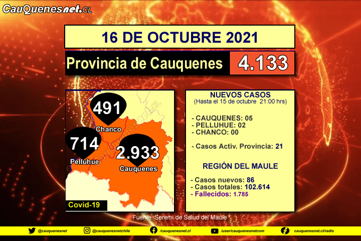 Sigue leyendo "16 de octubre 2021: #Cauquenes registró 05 nuevos casos de Coronavirus y #Pelluhue 02"