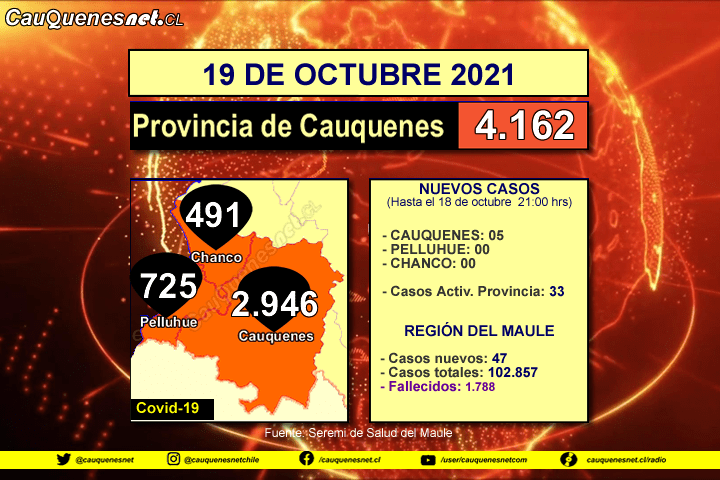 Sigue leyendo "19 de octubre 2021: #Cauquenes sumó 05 nuevos contagiados de Coronavirus"