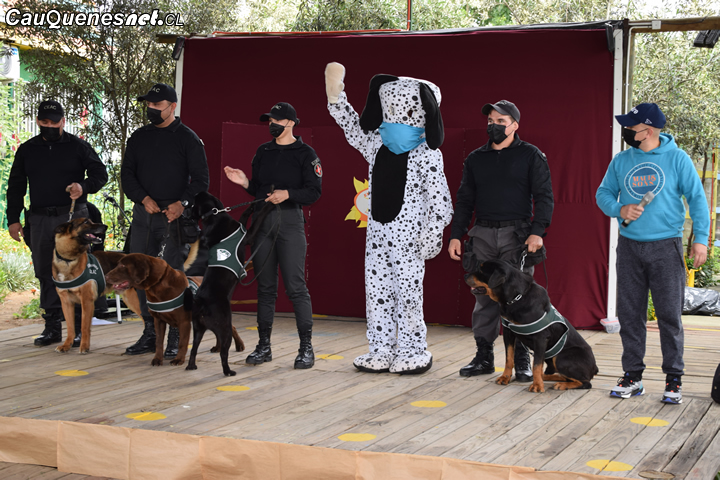 Los canes adiestrados de Cauquenes, Evan (labrador retriever) Loky (pastor Belga) y Ayron (rottweiler) acompañados de sus guías, se lucieron con una impecable presentación, a lo que se sumó la estrella de la jornada: Boby un perrito corpóreo, que saco varias risas en la instancia.