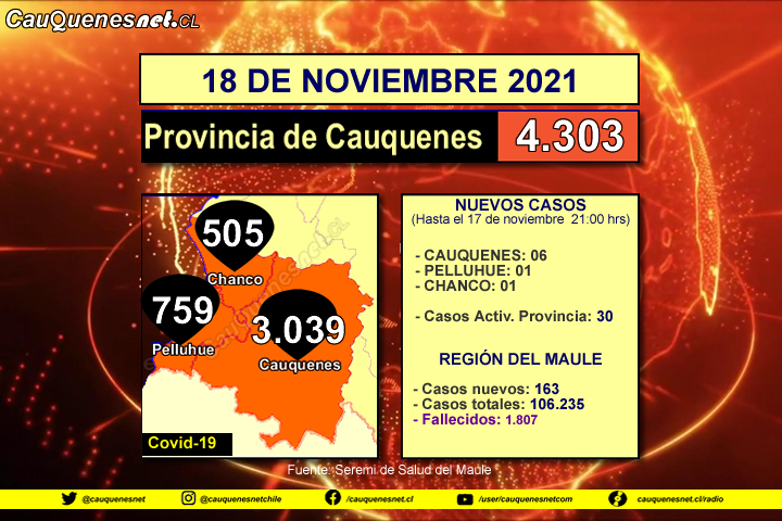 La Seremi de Salud del Maule confirmó 106 mil 235 casos de COVID-19 en la Región, indicando 163 casos nuevos para el informe del jueves 18 de noviembre. Los datos considerados, fueron recogidos hasta las 21:00 horas del 17 de noviembre.