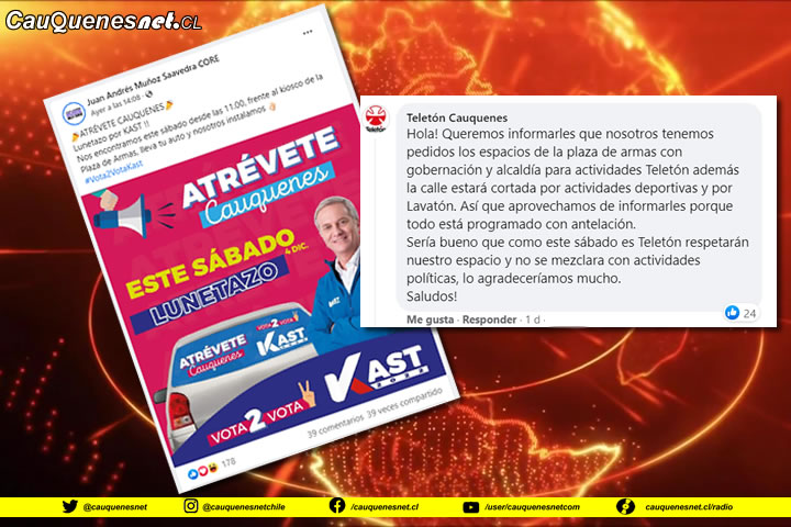 Dicha actividad de inmediato encendió las alertas de los voluntarios cauqueninos de la Teletón, quienes respondieron a la publicación de Muñoz, señalando: «Queremos informarles que nosotros tenemos pedidos los espacios de la plaza de armas con gobernación y alcaldía para actividades Teletón además la calle estará cortada por actividades deportivas y por Lavatón. Así que aprovechamos de informarles porque todo está programado con antelación (…) Sería bueno que como este sábado es Teletón respetarán nuestro espacio y no se mezclara con actividades políticas, lo agradeceríamos mucho».