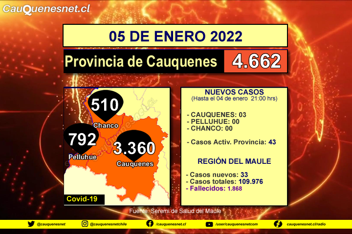 Este miércoles 05 de enero, con los nuevos casos de #Cauquenes, el total acumulado provincial llegó a 4.662 casos, con 43 casos activos provinciales. En la Región del #Maule se llegó a 33 contagios diarios.