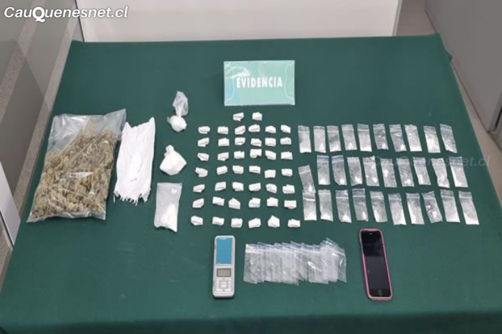 Interceptada por Carabineros y tras el registro del vehículo se encontraron tres bolsas de nylon con cannabis Sativa (marihuana) a granel, además de 45 unidades dosificadas de (marihuana) en papel de color blanco, tres bolsas contenedoras de clorhidrato de cocaína a granel, un envoltorio de papel blanco cuadriculado con dos trozos tipo «roca» de clorhidrato de cocaína, 30 bolsas dosificadas contenedora de clorhidrato de cocaína y 1 pesa digital tipo gramera.