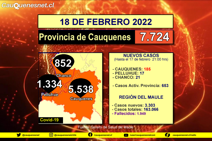 Este viernes 18 de febrero, con los nuevos casos de #Cauquenes, #Chanco y #Pelluhue, el total acumulado provincial llegó a los 7.724 casos, con históricos 653 casos activos provinciales. En la Región del #Maule se llegó a los 3.303 contagios diarios, superando los 163 mil casos acumulados y sumando 10 fallecidos.