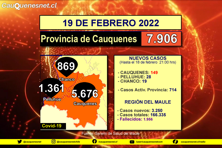 Este sábado 19 de febrero, con los nuevos casos de #Cauquenes, #Chanco y #Pelluhue, el total acumulado provincial llegó a los 7.906 casos, con históricos 714 casos activos provinciales. En la Región del #Maule se llegó a los 3.250 contagios diarios, superando los 166 mil casos acumulados y sumando 07 fallecidos.