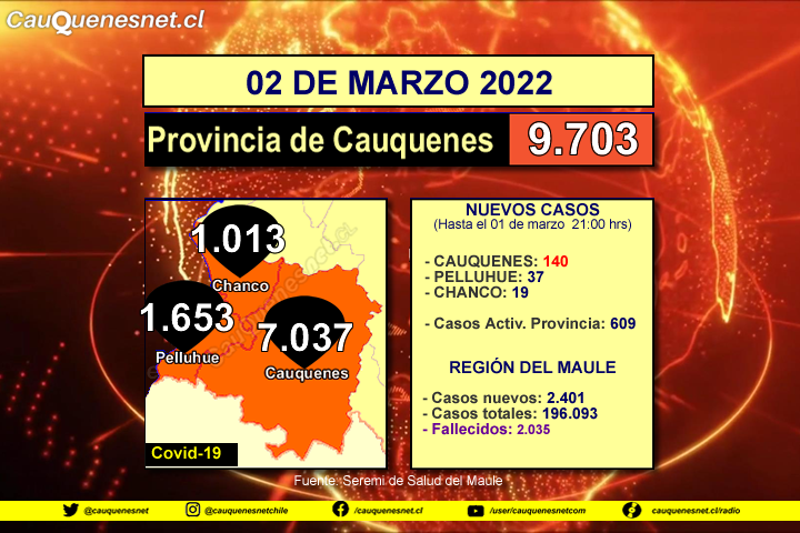 Este miércoles 02 de marzo, con los nuevos casos de #Cauquenes, #Chanco y #Pelluhue, el total acumulado llegó a los 9.703 casos, con 609 casos activos provinciales. En la Región del #Maule se llegó a los 2.405 contagios diarios, superando los 196 mil casos acumulados.