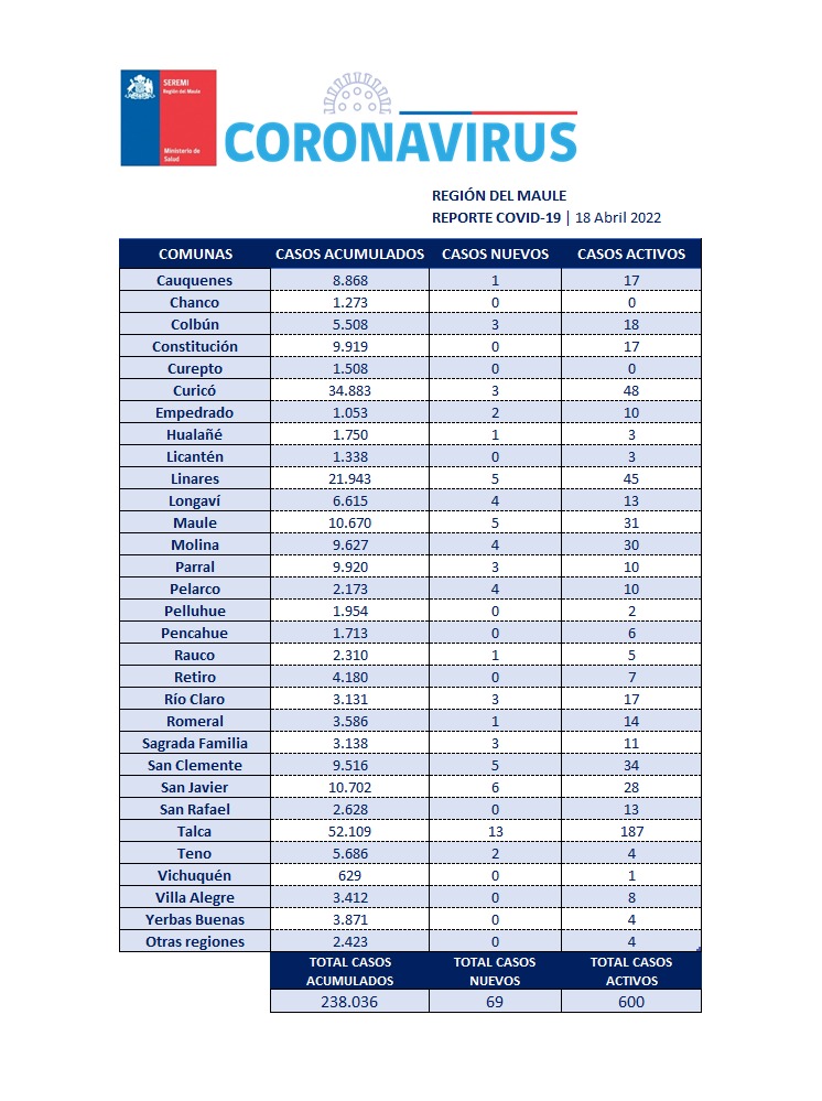 En la Región del Maule este lunes 18 de abril se registraron 69 nuevos casos, con 600 casos activos. En la gráfica el detalle por comunas.