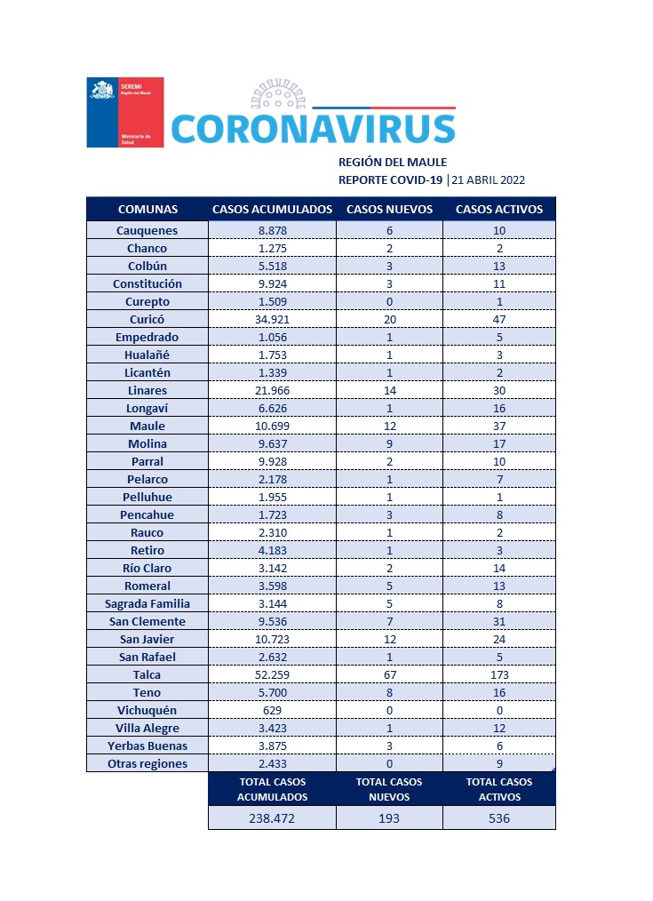 En la Región del Maule este jueves 21 de abril se registraron 193 nuevos casos, con 536 casos activos y 238 mil 472 casos acumulados desde el principio de la pandemia. En la gráfica el detalle por comunas.