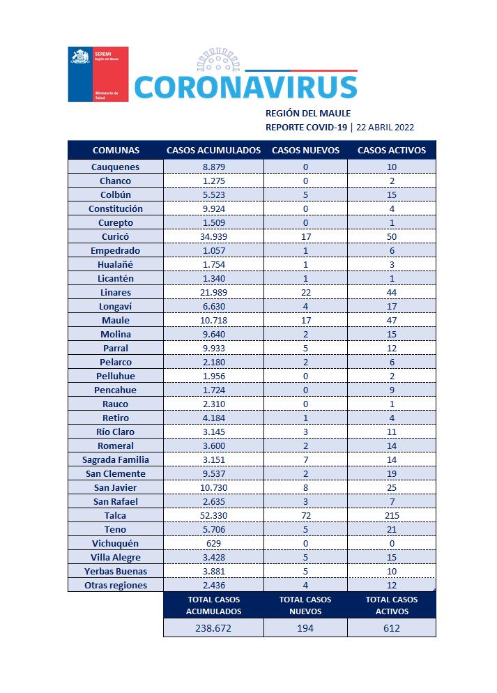 En la Región del Maule este viernes 22 de abril se registraron 194 nuevos casos, con 612 casos activos y 238 mil 672 casos acumulados desde el principio de la pandemia. En la gráfica el detalle por comunas.