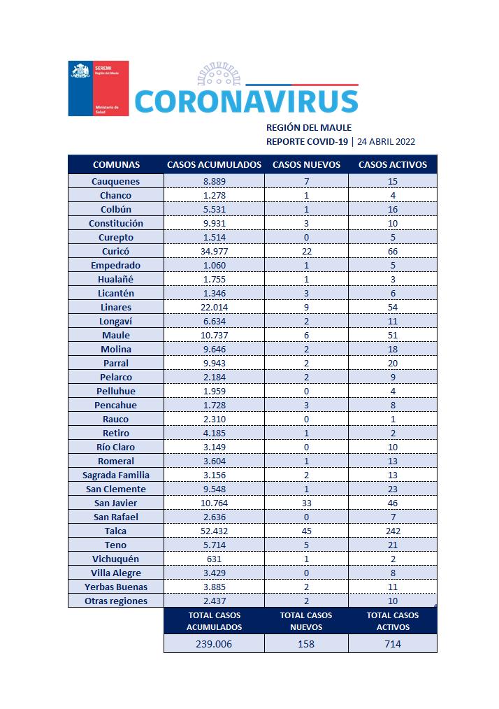 En la Región del Maule este domingo 24 de abril se registraron 158 nuevos casos, con 714 casos activos y 239 mil 006 casos acumulados desde el principio de la pandemia. En la gráfica el detalle por comunas.