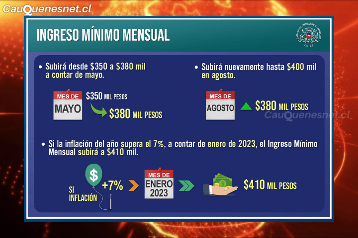 En lo medular, el grueso del texto aprobado previamente por la Cámara se mantuvo. Este considera un IMM de $380 mil, a contar del 1 de mayo, y de $400 mil, a partir del 1 de agosto. En conjunto, ambos aumentos suman un reajuste total de aproximadamente 14,3%.