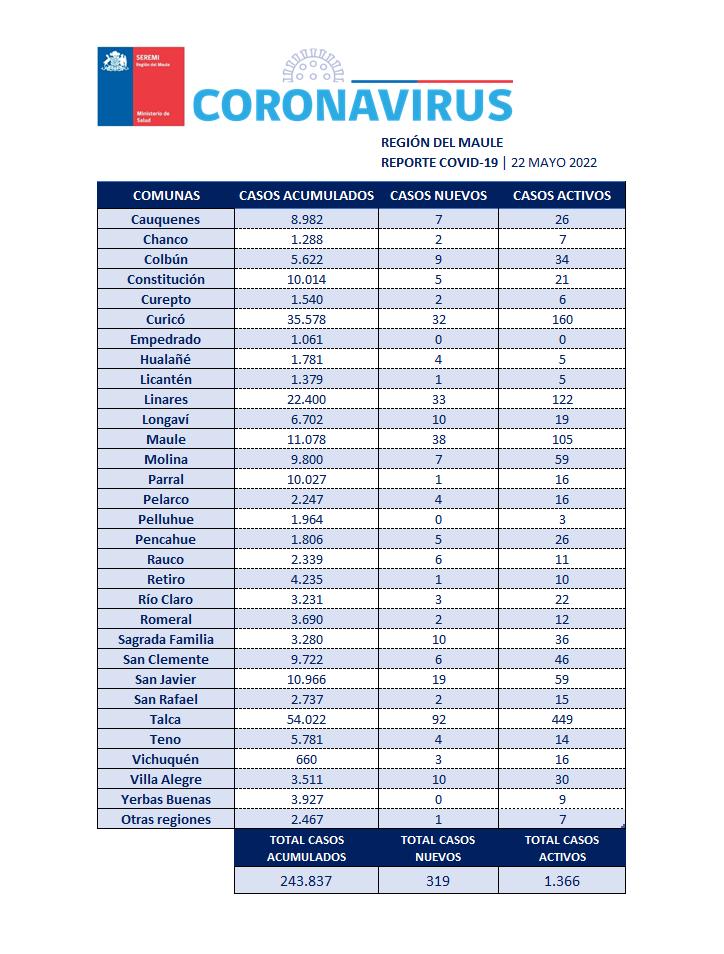 En la Región del Maule este domingo 22 de mayo se registraron 319 nuevos casos, con 1.366 casos activos y 243 mil 837 casos acumulados desde el principio de la pandemia. En la gráfica el detalle por comunas.